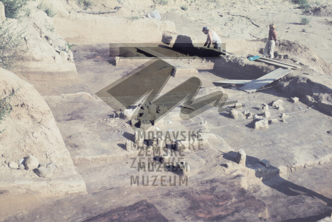 Preparování kulturní vrstvy. Tmavé plochy v popředí vpravo - ohnistě z horizontu aurignacienu.
