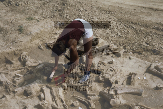 L. Seitl při čištění kulturní vrstvy s mamutími kostmi.