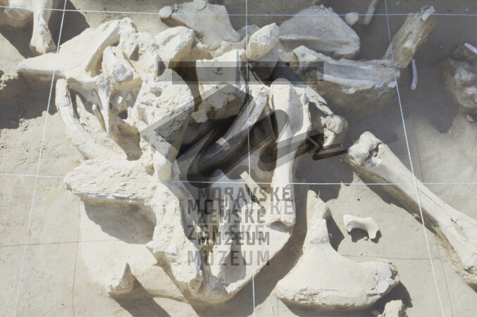 Akumulace mamutích kostí v gravettienské kulturní vrstvě.